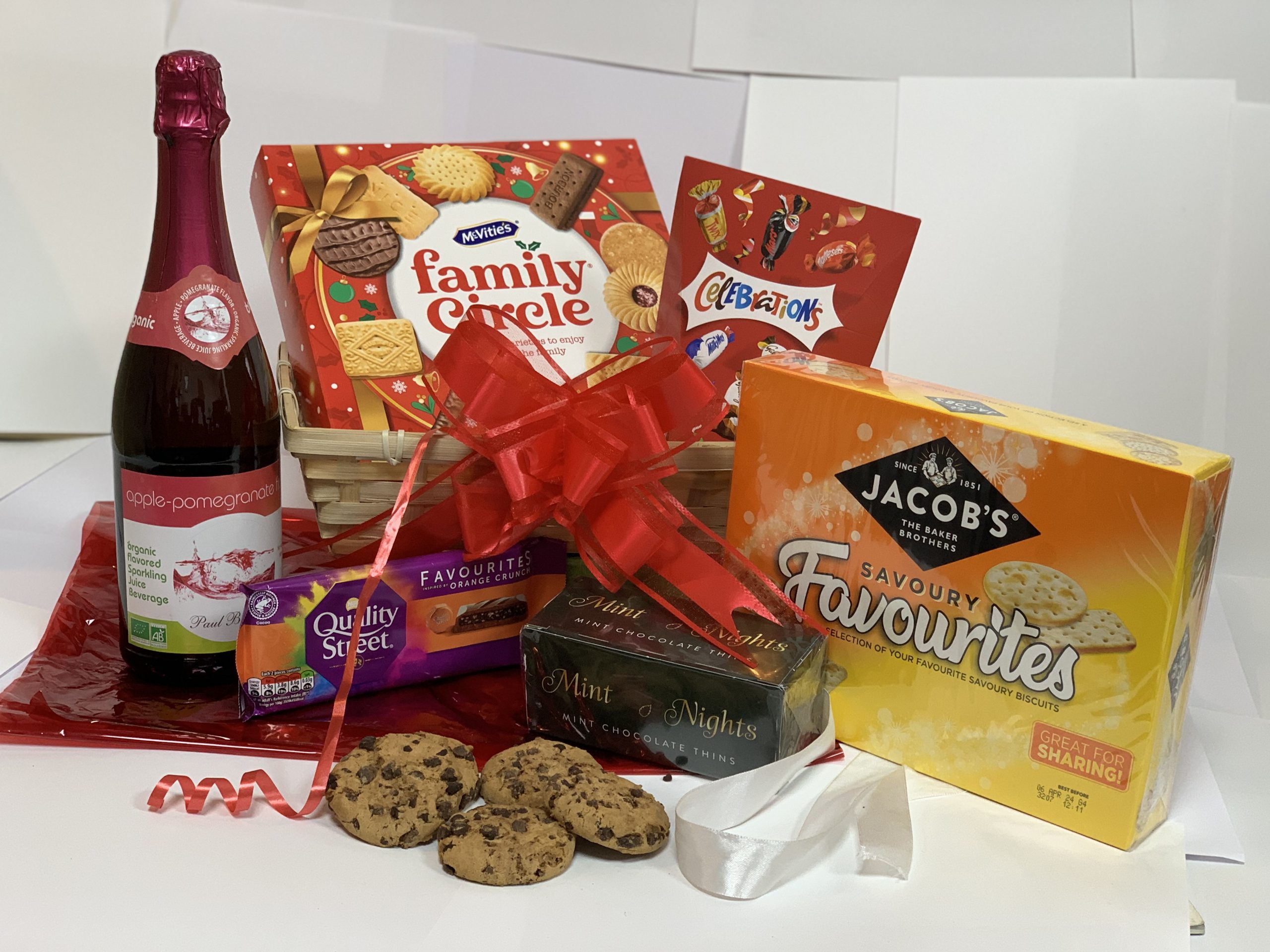 Our Variety Hamper includes freshly baked cookies, a bottle of non-alcoholic wine, a box of mints, savoury biscuits, a family variety box of biscuits, a box of Celebrations sweets, and a bar of chocolate, all beautifully presented in a basket…