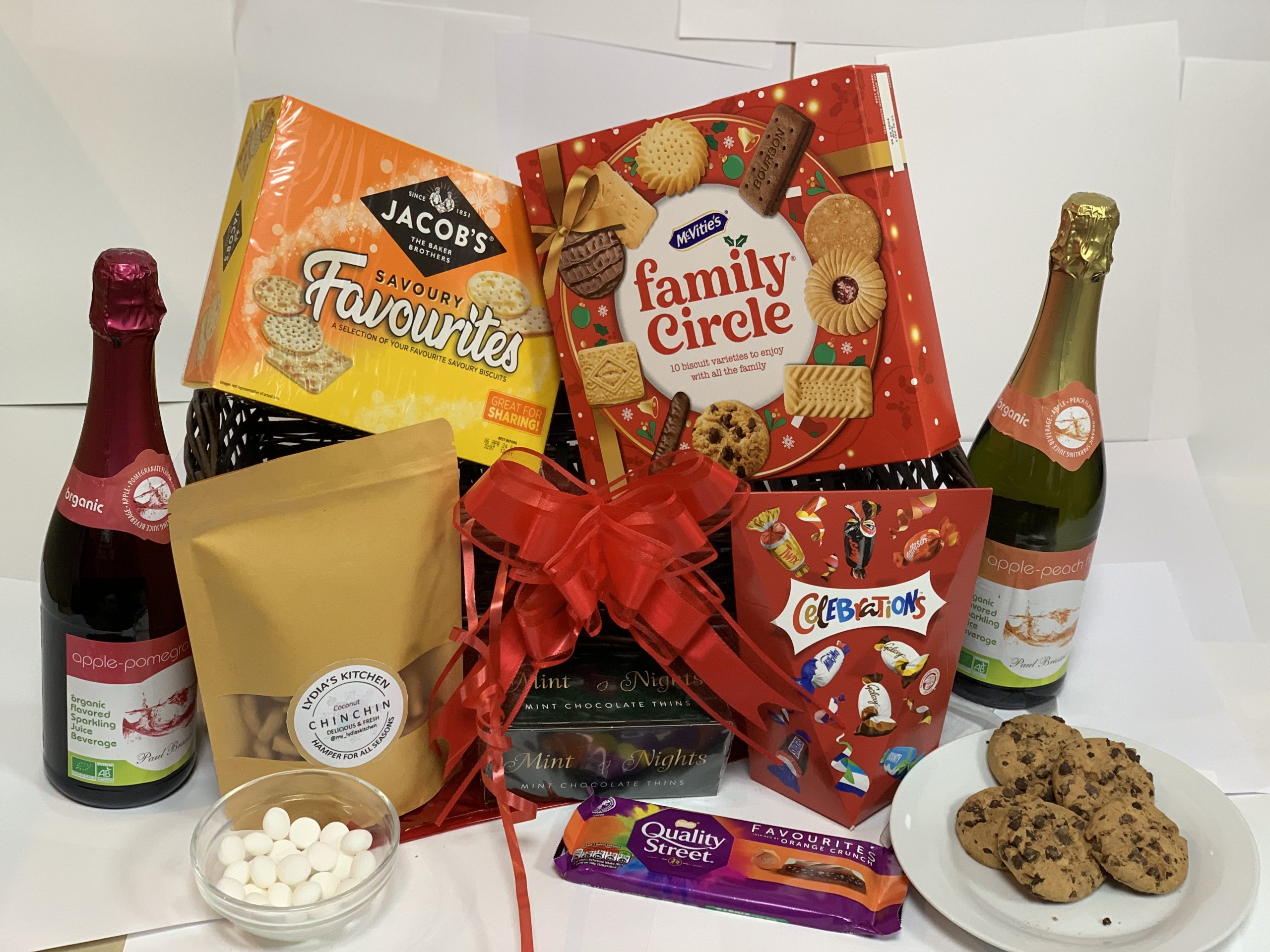 Our Variety Hamper includes freshly baked cookies, Fresh Chin Chin, two bottles of non-alcoholic wine, a box of mints, savoury biscuits, a family variety box of biscuits, a box of Celebrations sweets, and a bar of chocolate, all beautifully presented…